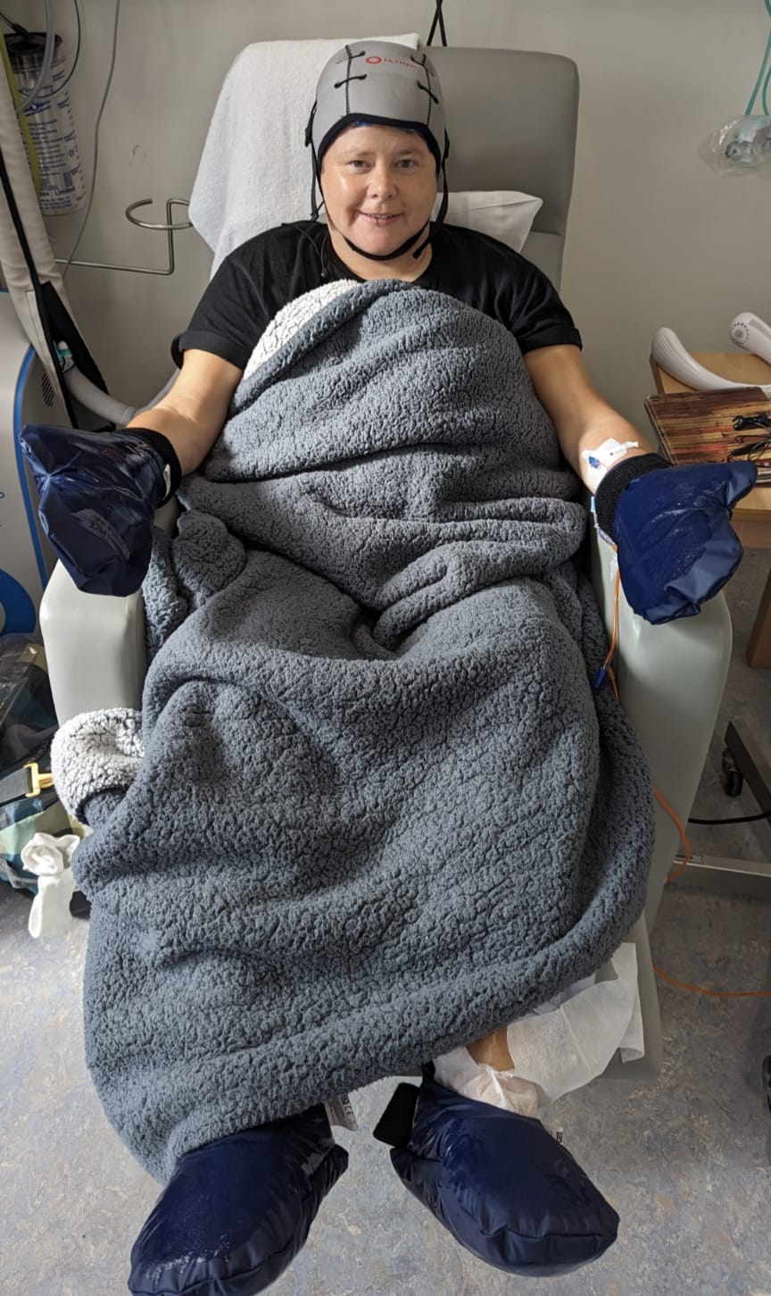 After 12 weeks recovery, Em began chemotherapy to ensure all the cancer was gone. She had 4 cycles of chemo and again, she managed to keep working during this time. Em chose to wear a cold cap to help prevent hair loss during her treatment, and also took part in a trial which meant she wore ‘cold boots’ and ‘cold gloves’ during her chemo, to reduce the side effects of neuropathy (damage caused to nerves in the tips of fingers and toes).